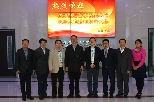 1月9日,杭州銀行董事長吳太普一行四人到訪華訊方舟,集團副董事長兼總裁吳光勝、首席科學家黃永江、高級副總裁Sunny等高層領導熱情接待了吳董一行。 在吳總的陪同下